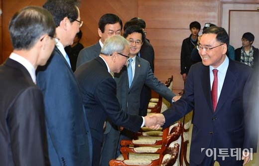 정홍원 국무총리와 현오석 경제부총리가 3일 오전 서울 세종로 정부서울청사에서 열린 ‘국가정책조정회의’에 앞서 인사를 나누고 있다. 방인권 기자 bink7119@