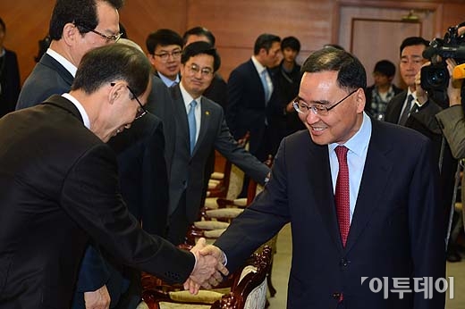 정홍원 국무총리가 3일 오전 서울 세종로 정부서울청사에서 열린 ‘국가정책조정회의’에 참석해 국무위원들과 인사를 나누고 있다. 방인권 기자 bink7119@