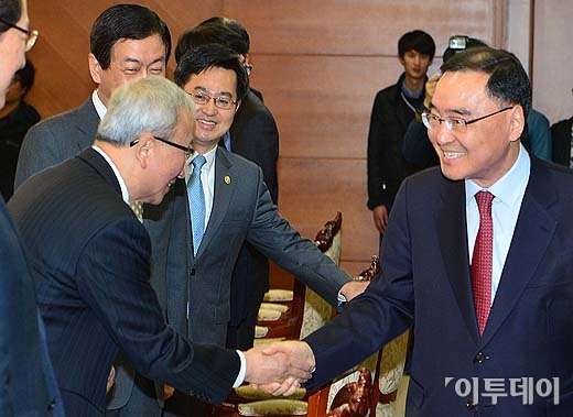 [포토]인사 나누는 정홍원 국무총리와 현오석 경제부총리