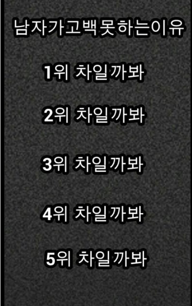 게시물에 따르면 남자가 이성에게 고백을 하지 못 하는 이유는 1위부터 5위까지가 모두 ‘차일까 봐’ 이다. 한 가지 이유로 고백을 못한다는 것이 공감과 더불어 웃음을 자아낸다.