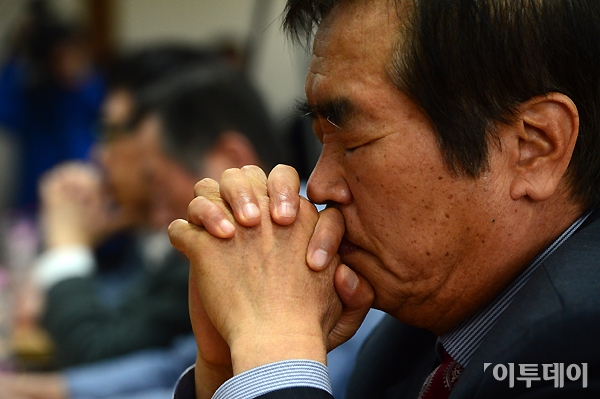 개성공단기업협회가 개성공단 조업 중단과 근로자 철수에 따른 후속 대책을 논의하기 위해 ‘개성공단 정상화 촉구 비상대책위원회’를 구성했다. 비상대책위원회가 3일 오후 여의도 중소기업중앙회에서 임시 총회를 개최했다. 총회에 참석한 개성공단 입주 기업인이 두 손을 모으고 생각에 잠겨있다. 노진환 기자 myfixer@