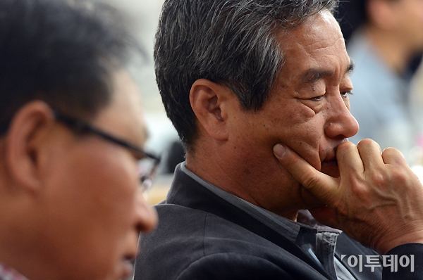 개성공단기업협회가 개성공단 조업 중단과 근로자 철수에 따른 후속 대책을 논의하기 위해 ‘개성공단 정상화 촉구 비상대책위원회’를 구성했다. 3일 오후 여의도 중소기업중앙회에서 열린 임시 총회에서 개성공단 입주 기업인이 심각한 표정으로 생각에 잠겨있다. 노진환 기자 myfixer@