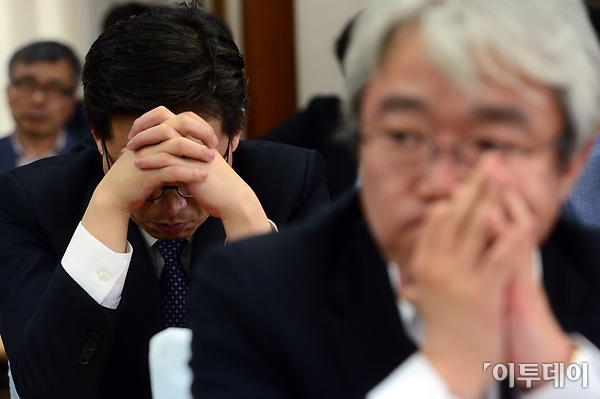 개성공단기업협회가 개성공단 조업 중단과 근로자 철수에 따른 후속 대책을 논의하기 위해 ‘개성공단 정상화 촉구 비상대책위원회’를 구성했다. 비상대책위원회가 3일 오후 여의도 중소기업중앙회에서 임시 총회를 개최한 가운데 총회에 참석한 개성공단 입주 기업인들이 두 손을 모으고 생각에 잠겨있다. 노진환 기자 myfixer@