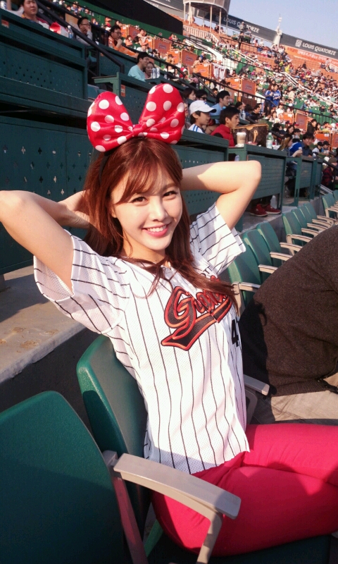 사진 속 박은지는 부산 사직구장에서 박은지는 롯데 자이언츠의 유니폼을 입고 빨간 리본 머리띠를 하고 활짝 웃고 있다.