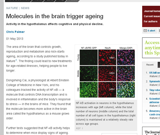 최근 미국의 알버트 아인슈타인 의과대학 연구팀은 쥐의 뇌 시상하부 안에 존재하는 'NF-kB'이 노화를 촉진하거나 지연하는 역할을 한다는 사실을 밝혀냈다.