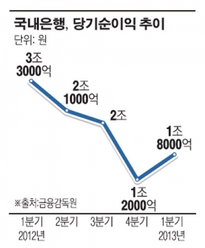 5일 금융감독원에 따르면 국내 은행의 올 1분기 당기순이익은 1조8000억원으로 지난해 같은 기간 3조3000억원 대비 1조5000억원이 감소했다. 금리하락에 따른 이자이익 감소가 9000억원에 이르고, 일회성 주식매각익이 발생하지 않은 것이 주 원인이다.
