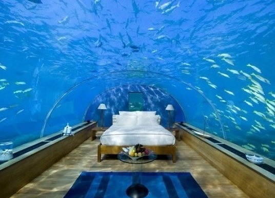 바닥이 유리인 비행기가 발 밑으로 풍경이 다 보인다면 천장이 유리인 침실은 머리 위로 바닷속이 다 보인다. 이 침실은 해저에 위치해 있어 자고 일어나면 바다가 한 눈에 들어온다.