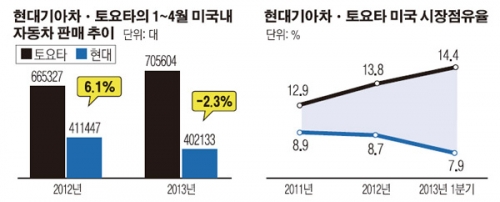 현대차처럼 노동조합의 주말 특근 거부에 따른 국내 생산 감소 문제도 또 다른 원인으로 꼽힌다. 기아차는 현재 해외 공장의 초과 가동을 통해 국내 생산 감소(-7.7%) 분을 메우고 있다. 현대차와 기아차의 대미 수출량도 엔저의 직격탄을 맞았다. 현대기아차의 올해 1~4월 미국 내 자동차 판매 대수는 40만2133대로, 지난해 같은 기간 41만1447대보다 2.3% 줄었다.