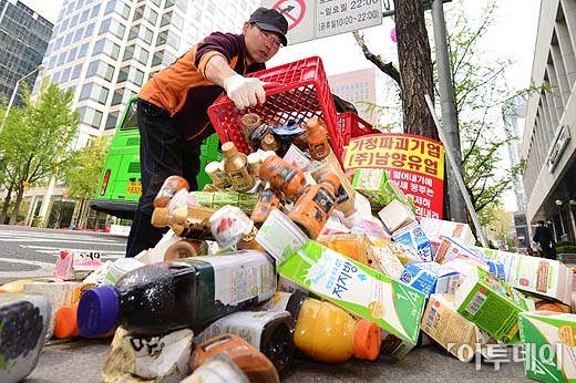 남양유업대리점 피해자협의회 회원이 6일 오전 서울 중구 남대문로 남양유업본사 앞에서 제품을 바닥에 폐기하고 있다. 방인권 기자 bink7119@