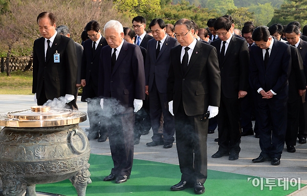 김한길 민주당 새 대표와 지도부가 6일 오전 서울 동작구 국립현충원을 찾아 참배하고 있다. 노진환 기자 myfixer@
