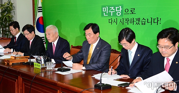 김한길 민주당 새 대표가 6일 오전 국회 당대표실에서 열린 최고위원회의에 참석해 모두발언을 하고 있다. 노진환 기자 myfixer@