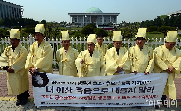 중소상공인들과 시민사회단체 회원들이 6일 오후 여의도 국회 정문 앞에서 상복을 입고 기자회견을 열고 있다. 기자회견에 참석한 중소상공인들과 시민사회단체 회원들이 생존권 보호법안 처리를 촉구하고 있다. 노진환 기자 myfixer@