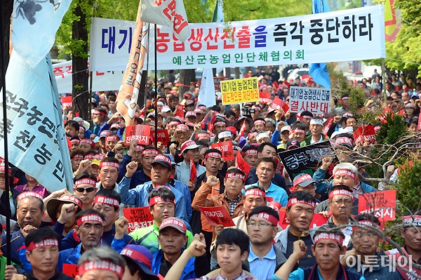 ‘대기업 농업생산 진출 저지 전국농민대회’가 6일 오후 여의도 산업은행 앞에서 진행됐다. 참석한 농민들이 구호를 외치고 있다. 노진환 기자 myfixer@