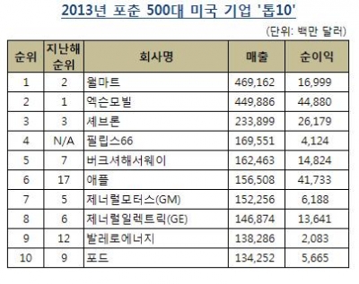 세계 최대 소매업체 월마트가 매출 기준 ‘2013년 미국 500대 기업’ 1위 자리를 탈환했다고 6일(현지시간) 미국 경제전문지 포춘이 보도했다.