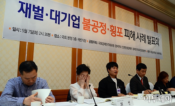 재벌·대기업 불공정·횡포 피해 사례 발표회가 7일 오후 여의도 국회 귀빈식당에서 열렸다. 이창섭 남양유업 대리점협의회 회장(왼쪽 세 번째)이 피해 사례를 발표하고 있다. 노진환 기자 myfixer@