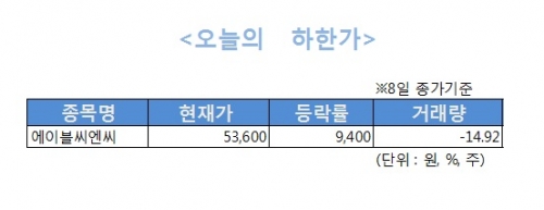 8일 국내 주식시장에서는 유가증권시장 1종목만이 하한가로 마감했다. 그 주인공은 에이블씨엔씨로 이날 9400원(14.92%) 급락한 5만3600원에 거래를 마쳤다.