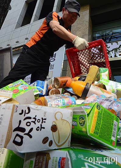 남양유업대리점 피해자협의회 소속 대리점주들이 8일 오전 서울 남대문로 남양유업 본사 앞에서 제품 강매 관행을 규탄하는 집회를 갖고 항의의 의미로 제품들을 쏟아붓고 있다. 방인권 기자 bink7119@