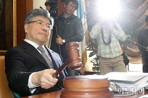 김중수 한국은행 총재가 9일 오전 서울 중구 남대문로 한국은행 본관에서 열린 ‘금융통화위원회 본회의’에서 의사봉을 두드리고 있다. 방인권 기자 bink7119@