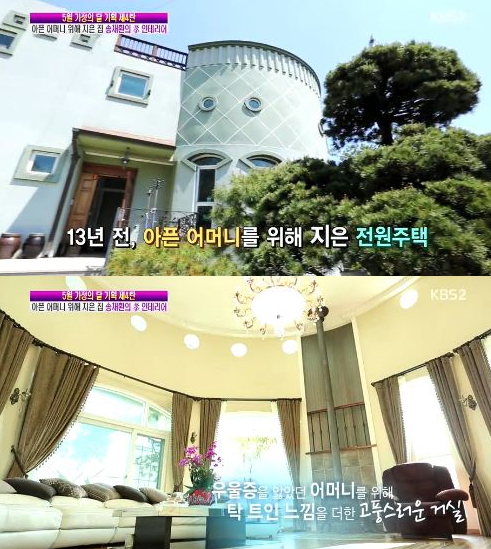 9일 오전 방송된 KBS2 ‘여유만만’에서 송채환은 자신의 어머니와 함께 출연해 힘들었던 가정사와 집을 공개했다. 공개된 송채환의 집은 당구장에 영화관, 자연과 조화를 이룬 넓은 마당에 정자까지 있는 대저택.