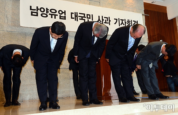 영업직원의 폭언 음성 파일이 공개되면서 파문에 휩싸인 남양유업이 대국민 사과문을 발표했다. 9일 오전 김웅 남양유업 대표이사와 임원진들이 중구 중림동 브라운스톤에서 기자회견을 갖고 고개 숙여 사과하고 있다. 노진환 기자 myfixer@