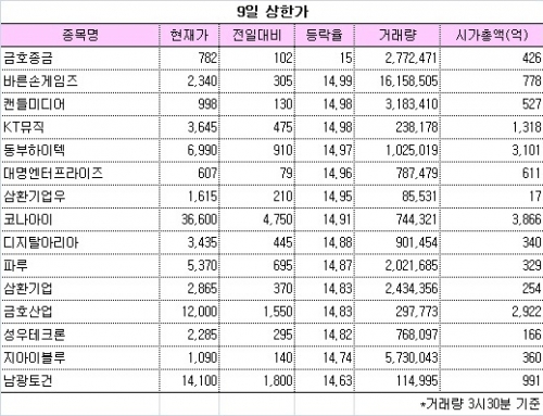 9일 한국거래소에 따르면 유가증권 6개, 코스닥 9개 등 총 15개 종목이 상한가로 마감했다.