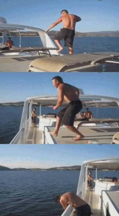 공개된 ‘폼 잡는 남자의 최후’ 영상에는 요트 위에서 다이빙을 하려는 듯 폼을 잡고 있는 한 남성의 모습이 담겨 있다. 이 남성은 잔뜩 폼을 잡고 바다를 향해 달려갔지만 미끌어져 요트 난간을 넘지 못해 보는 이들을 폭소케 했다.
