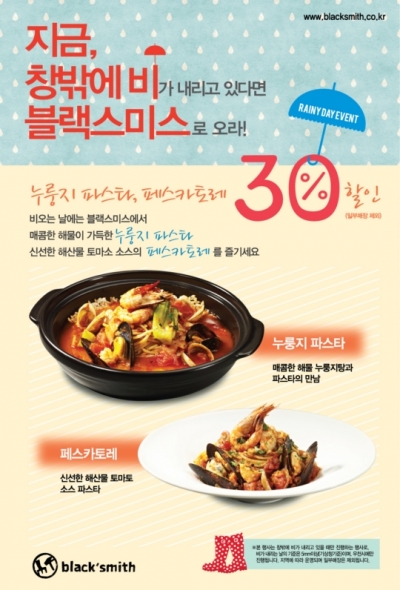레이니 데이 이벤트는 기상청 발표 기준 5㎜이상의 비 오는 날 블랙스미스의 매콤한 해물 국물이 일품인 ‘누룽지 파스타’와 해산물이 들어간 ‘페스카토레’를 30% 할인하는 고객행사다.