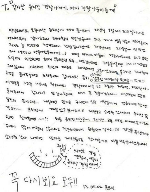 9일간 유치장 생활을 하고 구치소로 옮겨가기 전 A양은 유치장 관리 경찰들에게 한 통의 편지를 보냈다.