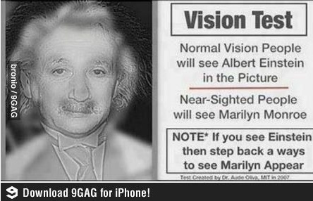 사진 속에는 한 인물의 사진이 담겨 있고 사진 옆 글귀에는 정상 시력인 사람은 ‘아인슈타인’이 보일 것이고 시력이 나쁜 편이면 ‘마릴린 먼로’가 보일 것이라고 쓰여 있다.
