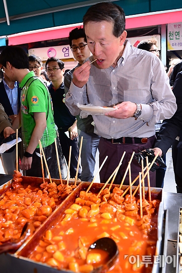 허창수 전경련 회장이 12일 오후 서울 대림동 우리시장을 방문해 떡볶이를 시식하고 있다. 노진환 기자 myfixer@