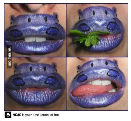 게시물은 흔히 쓰이지 않는 보라색 립스틱을 아주 기발하게 이용한 사진으로 사진 속에는 하마를 연상케하는 입술사진 4장이 담겨있다. 입술을 하마 입으로 하고 윗입술 위쪽으로 하마의 귀와 눈을 그려 입술 전체가 마치 하마처럼 보이도록 한 것. 4장의 사진이 각각 다른 포즈를 취하고 있어 재미를 더하고 있다.