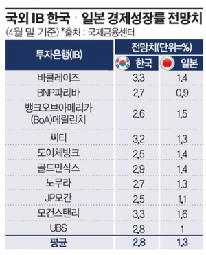 반면 일본 경제에 대한 전망은 3개월 사이 호전됐다. 10개 IB는 지난달 말 일본의 올해 경제성장률을 1.3%로 전망했다. 이는 지난 1월 전망치 0.9%보다 0.4%포인트 상승한 것이다. 내년 경제성장률 전망도 같은 기간 1.1%에서 1.4%로 올랐다.