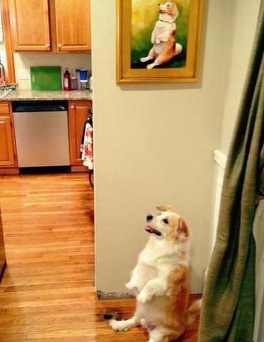 사진 속 개는 벽에 걸린 그림 속 개와 똑같은 자세를 취하고 있어 웃음을 자아낸다. 그림처럼 개가 자세를 취한 건지 개의 모습을 그림으로 옮긴 건지 구분이 되지 않는다.