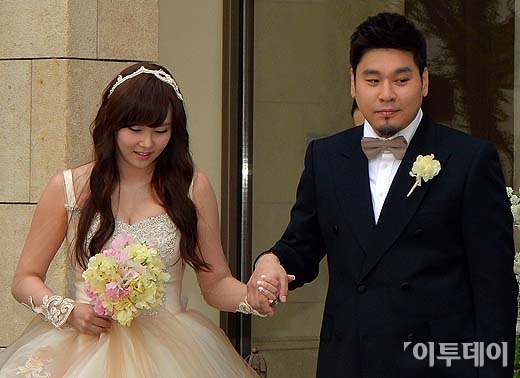 배우 김지우와 셰프 레이먼 킴이 13일 오후 서울 강남구 역삼동 더 라움에서 열린 결혼식 기자회견에 입장하고 있다. 방인권 기자 bink7119@