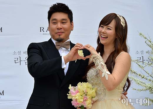 배우 김지우와 셰프 레이먼 킴이 13일 오후 서울 강남구 역삼동 더 라움에서 열린 결혼식 기자회견에서 포토타임을 갖고 있다. 방인권 기자 bink7119@