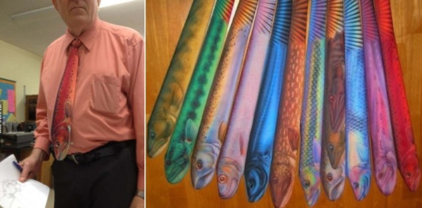 사진 속 남성은 실제 연어가 아닌 연어 그림이 그려진 넥타이를 목에 걸고 있다. 넥타이의 그림이 너무 사실적이어서 약간의 거부반응을 주기도 한다.