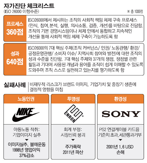 기표원과 표준협회는 이어 2010년엔 ‘사회적 책임 이행수준 진단 체크리스트’도 개발했다. 국내 기업들이 ISO26000에 어느 정도 대응하고 있는지 스스로 진단할 수 있게끔 이행 수준 체크리스트를 만든 것이다. 정부가 이행 수준을 판가름할 수 있는 도구를 마련, 국내 기업들이 ISO26000에 대응해 스스로 움직일 수 있도록 하자는 취지다. 현재 약 100여곳의 집단 및 기업들이 사용한 것으로 추정되고 있다.