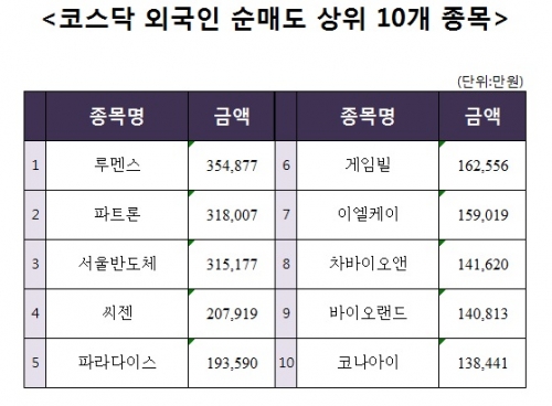 14일 외국인 순매도 상위 10개 종목