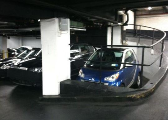 사진을 살펴보면 파란색 소형차는 주차장 진출입 코너와 기둥 사이에 주차된 모습이다. 하지만 소형차가 주차한 바로 옆에는 다른차 한 대가 주차돼 있어 차를 뺄수 없는 상태다.