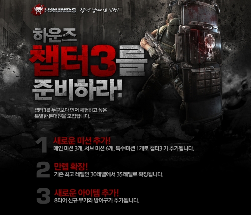참여대상은 20세 이상 서울에 거주하는 하운즈 30레벨 이용자다. 함께 참여할 분대원 6명을 구성해 하운즈 홈페이지 고객지원 메뉴의 1:1문의를 통해 분대원의 캐릭터명을 입력하면 신청이 완료된다. 당첨자는 21일 홈페이지 공지를 통해 발표하며, 체험장소는 개별적으로 안내된다. 챕터3 사전체험은 22일 진행한다.
