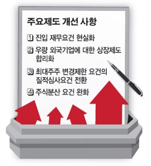 개정안에 따르면 코스피시장의 진입 재무요건은 현행 연 매출 300억원, 3년 평균 200억원에서 연 매출 1000억원, 3년 평균 700억원으로 상향 조정된다. 자기자본도 100억원에서 300억원으로 높아진다.