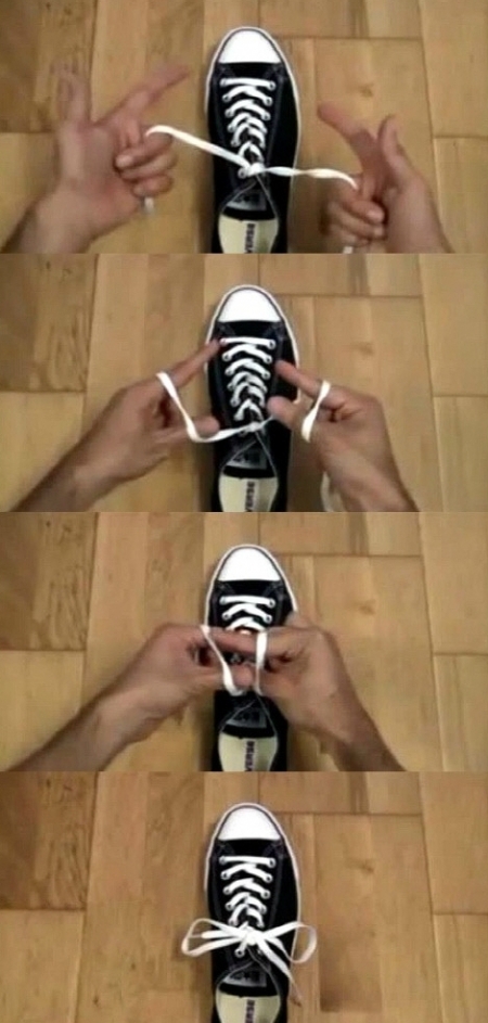 영상 속 남성은 양손 엄지와 검지를 이용해 신발끈을 양쪽으로 잡은 뒤 손가락을 교차하듯이 끈을 잡아당겨 간단하게 묶는다.