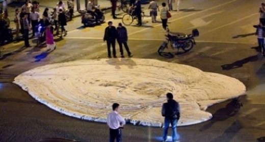 사진 속에는 넓이 30~40m² 정도의 흰 거품이 도로 위를 점령하고 있다. 현지 경찰은 "조사 결과 지하철 건설 때 만들어진 부산물일 가능성이 높다"고 발표했다.