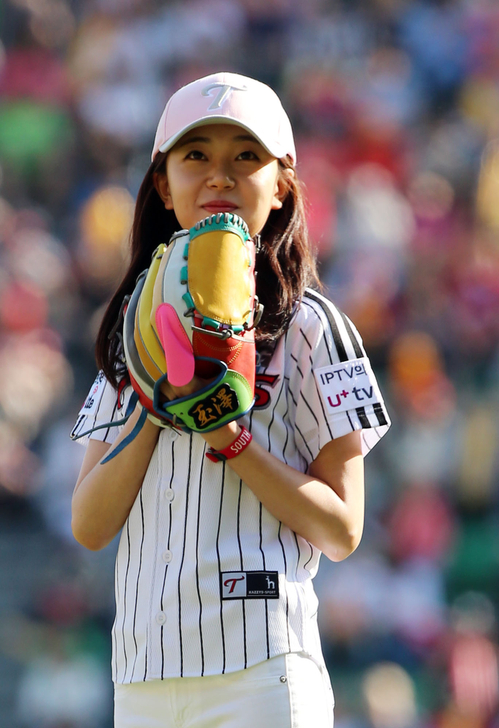 17일 서울 잠실야구장에서 열린 프로야구 LG와 KIA의 경기에서 배우 백진희가 시구하고 있다.