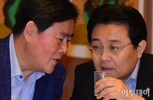 여야 원내사령탑으로 선출된 새누리당 최경환 원내대표와 민주당 전병헌 원내대표가 19일 서울 여의도 국회의사당 사랑재에서 첫 공식회동을 갖고 있다. 양지웅 기자 yangdoo@