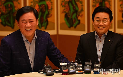 여야 원내사령탑으로 선출된 새누리당 최경환 원내대표와 민주당 전병헌 원내대표가 19일 서울 여의도 국회의사당 사랑재에서 첫 공식회동을 갖고 있다. 양지웅 기자 yangdoo@