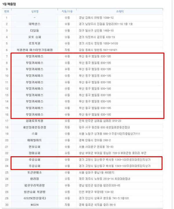 제546회 로또 1등 당첨자가 30명이나 쏟아진 가운데 부산의 한 판매점에서만 10명이 나왔다. 19일 나눔로또에 따르면 이달 18일 실시된 추첨에서 1등 당첨자는 모두 30명으로 당첨금은 각각 4억 594만원이다. 사진은 부산과 경기 일산의 중복 배출점이 게재된 나눔로또 홈페이지 사진.
