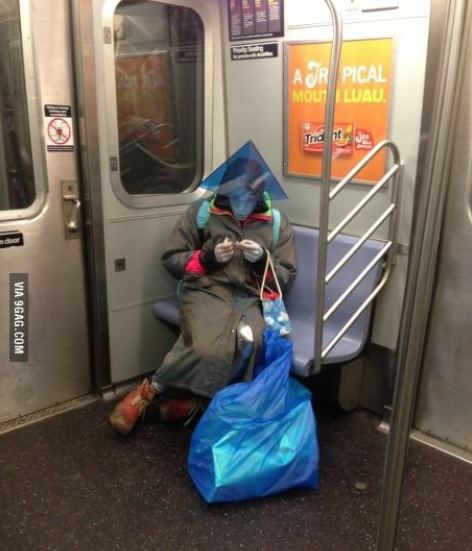 사진 속에는 외국의 지하철 내부 모습이 담겨있고 좌석에 한 사람이 앉아 무언가에 열중해 있다. 자리에 앉아 있는 사람은 투명한 파란색 원뿔형 모자를 쓰고 앞에는 파란색 큰 비닐을 놓아 둔 채로 자리잡고 있다. 마치 밖에 비가 오기 때문에 이를 피하기 위해 직접 제작한 아이템들로 보인다.