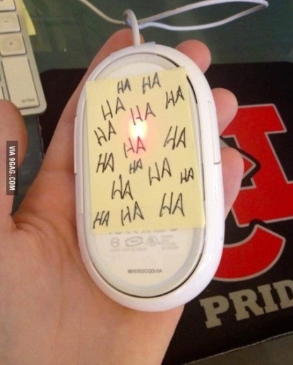 마우스가 안되는 이유 사진에는 누군가가 마우스 밑면에 포스트잇을 붙어놓은 뒤 한껏 비웃는 글을 적어놔 마우스가 안되는 이유의 궁극적인 이유를 알려준다.