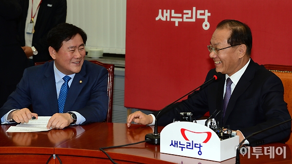 황우여 새누리당 대표와 최경환 원내대표가 20일 오전 여의도 국회 대표최고위원실에서 열린 최고위원회의에 참석해 이야기를 나누고 있다. 노진환 기자 myfixer@